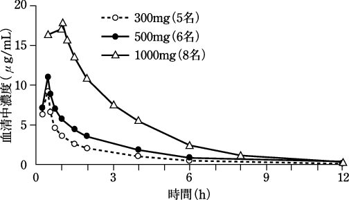 血液透析施行患者3例に300mgを30分点滴静注にて単回投与したときのCmax、AUC0→∞はそれぞれ12.5~13.3μg/mL、196~269μg・hr/mLであった。また、投与開始24時間後より血液透析を4時間施行した場合、本剤は59~66mgが除去され、見かけ上の血清中濃度半減期(T1/2d)は非透析時の半減期(T1/2β)17.9~23.2時間から2.78~4.00時間に短縮された12)。のう胞腎感染症の血液透析施行患者4例に週3回の血液透析後、300mgを30分点滴静注投与したとき、初回投与時のCmax、AUC0→∞及びT1/2はそれぞれ7.76~13.04μg/mL、258~662μg・hr/mL及び22.0~47.2時間であった。また、3回目投与の約64時間後より血液透析を4時間施行した場合、透析開始前から透析終了1時間後までの本剤の除去率は37.5~51.7%であった13)。