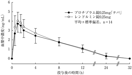 ブロチゾラム錠0.25mg「テバ」とレンドルミン錠0.25mgをクロスオーバー法により、健康成人男子にそれぞれ1錠(ブロチゾラムとして0.25mg)を絶食単回経口投与して血漿中未変化体濃度を測定し、得られた薬物動態パラメータ(AUC、Cmax)について統計解析を行った結果、両剤の生物学的同等性が確認された3)。