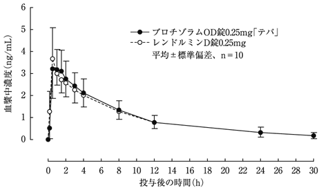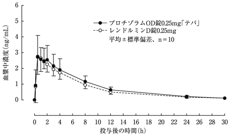ブロチゾラムOD錠0.25mg「テバ」とレンドルミンD錠0.25mgをクロスオーバー法により、健康成人男子にそれぞれ1錠(ブロチゾラムとして0.25mg)を絶食単回経口投与して血漿中未変化体濃度を測定し、得られた薬物動態パラメータ(AUC、Cmax)について90%信頼区間法にて統計解析を行った結果、log(0.80)~log(1.25)の範囲内であり、両剤の生物学的同等性が確認された3)。