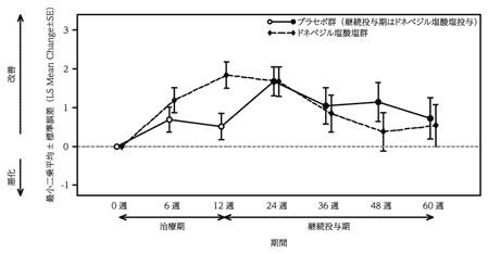 本試験では、認知機能障害、精神症状・行動障害の両症状に対するドネペジル塩酸塩の有効性がプラセボに比較して優れているという検証仮説は検証されていない18)。
