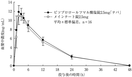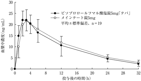 ビソプロロールフマル酸塩錠0.625mg「テバ」は、「含量が異なる経口固形製剤の生物学的同等性試験ガイドライン(平成24年2月29日薬食審査発0229第10号)」に基づき、ビソプロロールフマル酸塩錠2.5mg「テバ」を標準製剤としたとき、溶出挙動が等しく、生物学的に同等とみなされた3)。注)本剤の承認用量は1日1回0.625~5mgである。