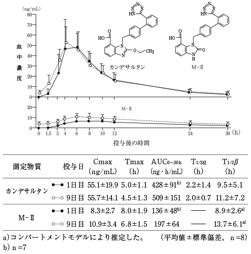 本態性高血圧症患者8例(38~68歳)に、1日1回4mgを朝食後に初回投与し、さらに1日休薬後連日7日間反復投与した時、いずれも血中には活性代謝物のカンデサルタン及び非活性代謝物M-Ⅱが検出されるが、未変化体はほとんど検出されない。1日目(初回投与後)及び9日目(7日間反復投与後)のカンデサルタンの血中濃度は図のとおりで、投与4~6時間後にピークに達した後、徐々に低下する4)。