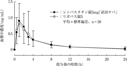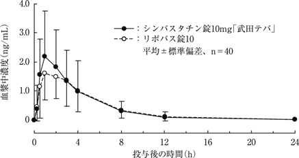 シンバスタチン錠5mg「武田テバ」又はシンバスタチン錠10mg「武田テバ」とリポバス錠5又はリポバス錠10をクロスオーバー法により、健康成人男子にそれぞれ1錠(シンバスタチンとして5mg又は10mg)を絶食単回経口投与して血漿中未変化体濃度を測定し、得られた薬物動態パラメータ(AUC、Cmax)について90%信頼区間法にて統計解析を行った結果、log(0.80)~log(1.25)の範囲内であり、両剤の生物学的同等性が確認された4)。