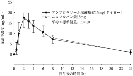 アンブロキソール塩酸塩錠15mg「タイヨー」とムコソルバン錠15mgをクロスオーバー法により、健康成人男子にそれぞれ1錠(アンブロキソール塩酸塩として15mg)を絶食単回経口投与して血清中未変化体濃度を測定し、得られた薬物動態パラメータ(AUC、Cmax)について統計解析を行った結果、両剤の生物学的同等性が確認された1)。