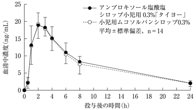 アンブロキソール塩酸塩シロップ小児用0.3%「タイヨー」と小児用ムコソルバンシロップ0.3%をクロスオーバー法により、健康成人男子にそれぞれ5mL(アンブロキソール塩酸塩として15mg)を絶食単回経口投与して血清中未変化体濃度を測定し、得られた薬物動態パラメータ(AUC、Cmax)について統計解析を行った結果、両剤の生物学的同等性が確認された1)。