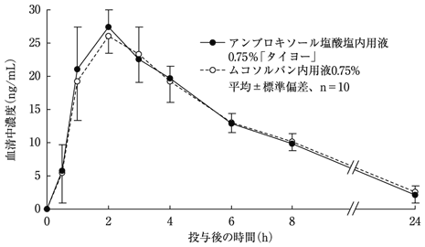 アンブロキソール塩酸塩内用液0.75%「タイヨー」とムコソルバン内用液0.75%をクロスオーバー法により、健康成人男子にそれぞれ2mL(アンブロキソール塩酸塩として15mg)を絶食単回経口投与して血清中未変化体濃度を測定し、得られた薬物動態パラメータ(AUC、Cmax)について統計解析を行った結果、両剤の生物学的同等性が確認された1)。