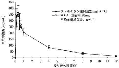 ファモチジン注射用20mg「テバ」とガスター注射用20mgをクロスオーバー法により、健康成人男子にそれぞれ1アンプル※(ファモチジンとして20mg)を絶食単回筋肉内投与して血漿中未変化体濃度を測定し、得られた薬物動態パラメータ(AUC、Cmax)について90%信頼区間法にて統計解析を行った結果、log(0.80)~log(1.25)の範囲内であり、両剤の生物学的同等性が確認された4)。※1.5mLの日局注射用水に溶解
