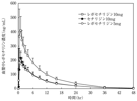 健康成人男性20例にレボセチリジン塩酸塩5mgを空腹時単回経口投与した時、血漿中レボセチリジン濃度は投与後1時間には最高血漿中濃度232.6ng/mLに到達した。血漿中濃度の消失半減期は約7.3時間であった。また、10mgを単回経口投与した時、投与量増量に伴うCmaxの上昇及びAUCの増加が認められた。セチリジン塩酸塩10mgを空腹時単回経口投与した時、血漿中レボセチリジン濃度は投与後1時間には最高血漿中濃度228.3ng/mLに達し、消失半減期は約7.3時間であった1),2)。レボセチリジン塩酸塩はセチリジン塩酸塩の半量で同様の血漿中レボセチリジン濃度が得られ、血漿中レボセチリジンのCmax及びAUC0-48は同等であった。