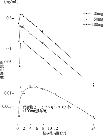 健康成人男性18例にピルシカイニド塩酸塩水和物25mg、50mg及び100mg注1)を空腹時単回経口投与したとき、消化管からの吸収は良好であり、血漿中濃度の推移は次のとおりであった2)。