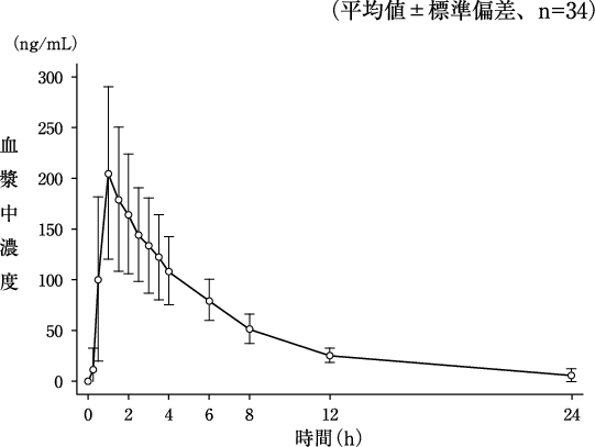 健康成人男性にエドキサバン30mgを空腹時単回経口投与したときの血漿中濃度推移及び薬物動態パラメータは次のとおりであった。また、食後に投与したときCmaxは13%上昇したが、AUCに影響は認められなかった5)。