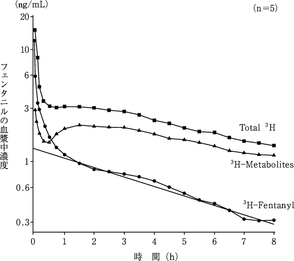 健康成人男性5例に3H-フェンタニル6.4μg/kgを静注投与した場合、フェンタニルの血漿中濃度は投与後60分以内に急速に低下し、投与量の約98%が消失した。その後は徐々に低下した。また、AUC(0-8)は平均約511ng/mL・minを示し、半減期は平均約3.6時間であった2)(外国人のデータ)。