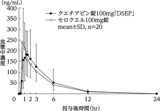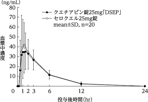 クエチアピン錠25mg「DSEP」とセロクエル25mg錠及びクエチアピン錠100mg「DSEP」とセロクエル100mg錠を、クロスオーバー法によりそれぞれ1錠(クエチアピンとしてそれぞれ25mg、100mg)健康成人男子に絶食後単回経口投与して血漿中クエチアピン濃度を測定した。得られた薬物動態パラメータ(AUC、Cmax)について統計解析を行った結果、両剤の生物学的同等性が確認された4)。