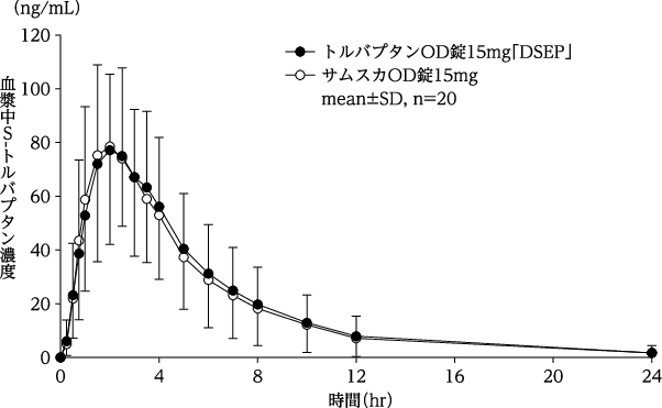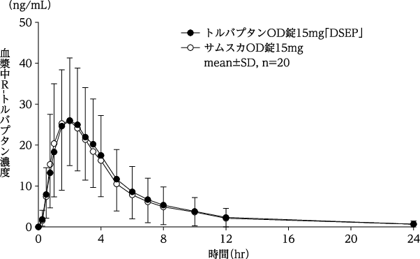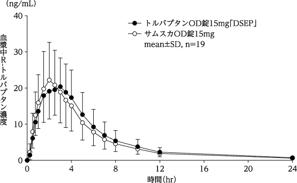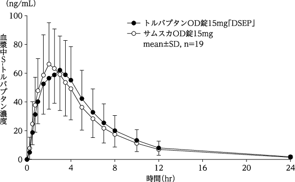 健康成人にトルバプタン15mgを単回経口投与した時、空腹時投与に比べ食後投与ではCmax及びAUCはそれぞれ1.3倍及び1.1倍であった4)。