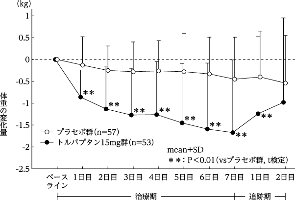 他の利尿薬を投与しても体液貯留が認められるうっ血性心不全患者を対象とした二重盲検比較試験において、トルバプタン15mg又はプラセボを1日1回7日間経口投与した。主要評価項目である最終投与時の体重変化量は、トルバプタン15mg群-1.54±1.61kg(ベースライン:59.42±12.30kg、53例)(平均値±標準偏差、以下同様)、プラセボ群-0.45±0.93kg(ベースライン:55.68±12.60kg、57例)であり、トルバプタン群では、プラセボ群に比較して有意な体重減少が認められた(p<0.0001、t検定)。体重減少は投与翌日よりみられ投与期間を通じて継続した(下図)。また、最終投与時における心性浮腫に伴う所見(頚静脈怒張、肝腫大、下肢浮腫)が改善した(下表)。