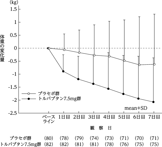他の利尿薬を投与しても体液貯留が認められる肝硬変患者を対象とした二重盲検比較試験において、トルバプタン7.5mg又はプラセボを1日1回7日間経口投与した。主要評価項目である最終投与時の体重変化量は、トルバプタン7.5mg群-1.95±1.77kg(ベースライン:59.35±12.69kg、82例)(平均値±標準偏差、以下同様)、プラセボ群-0.44±1.93kg(ベースライン:59.15±13.15kg、80例)であり、トルバプタン群では、プラセボ群に比較して有意な体重減少が認められた(p<0.0001、t検定)。体重減少は投与翌日よりみられ投与期間を通じて継続した(下図)。最終投与時における肝性浮腫に伴う所見(腹水量、腹囲、下肢浮腫)が改善した(下表)。また、臨床症状(腹部膨満感、倦怠感、臥位での圧迫感、呼吸困難感、全身状態)も改善した。