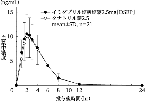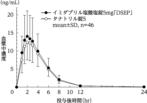 イミダプリル塩酸塩錠2.5mg、5mg及び10mg「DSEP」とタナトリル錠2.5、5及び10を、クロスオーバー法によりそれぞれ1錠(イミダプリル塩酸塩としてそれぞれ2.5mg、5mg及び10mg)健康成人男子に絶食単回経口投与して血漿中未変化体濃度を測定し、得られた薬物動態パラメータ(AUC、Cmax)について統計解析を行った結果、両剤の生物学的同等性が確認された6)。