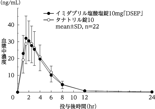 イミダプリル塩酸塩錠2.5mg、5mg及び10mg「DSEP」とタナトリル錠2.5、5及び10を、クロスオーバー法によりそれぞれ1錠(イミダプリル塩酸塩としてそれぞれ2.5mg、5mg及び10mg)健康成人男子に絶食単回経口投与して血漿中未変化体濃度を測定し、得られた薬物動態パラメータ(AUC、Cmax)について統計解析を行った結果、両剤の生物学的同等性が確認された6)。