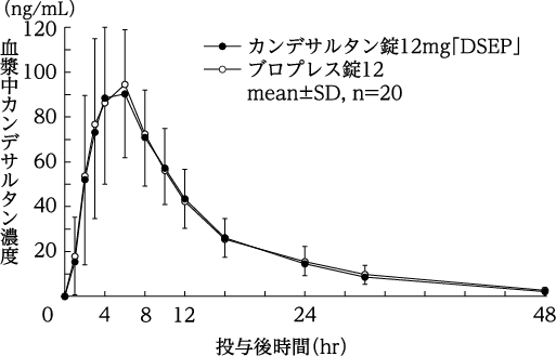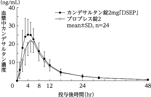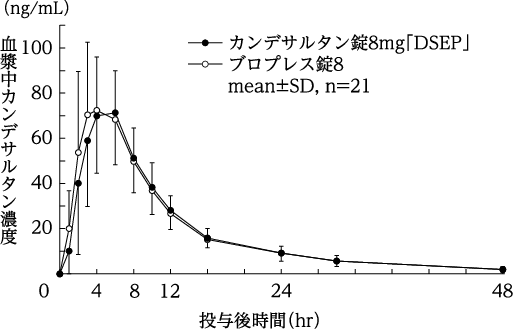 本態性高血圧症患者8例(38~68歳)に、1日1回4mgを朝食後に初回投与し、さらに1日休薬後連日7日間反復投与した時、いずれも血中には活性代謝物のカンデサルタン及び非活性代謝物M-Ⅱが検出されるが、未変化体はほとんど検出されない。1日目(初回投与後)及び9日目(7日間反復投与後)のカンデサルタンの血中濃度は、投与4~6時間後にピークに達した後、徐々に低下する4)。