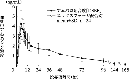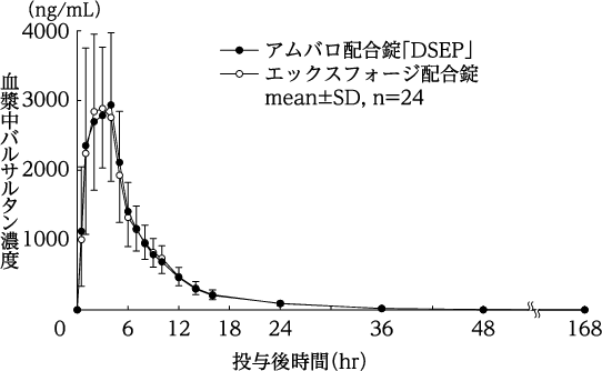 アムバロ配合錠「DSEP」とエックスフォージ配合錠を、クロスオーバー法によりそれぞれ1錠(バルサルタンとして80mg及びアムロジピンとして5mg)健康成人男子に絶食時単回経口投与して血漿中未変化体(バルサルタン及びアムロジピン)濃度を測定した。得られた薬物動態パラメータ(AUC、Cmax)について90%信頼区間法にて統計解析を行った結果、バルサルタン濃度及びアムロジピン濃度はいずれもlog(0.80)~log(1.25)の範囲であり、両剤の生物学的同等性が確認された8)。