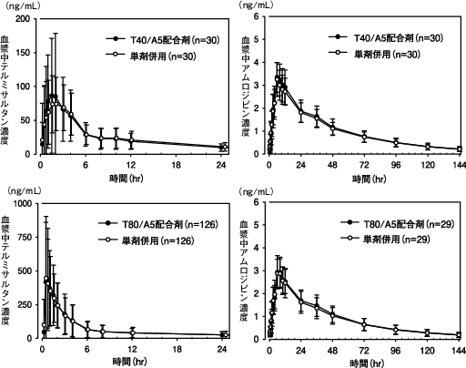 副作用発現割合はT80/A5mg配合剤で0.9%(1/112例)、T40/A5mg配合剤で1.8%(2/113例)であった。T80/A5mg配合剤投与群の副作用は低血圧0.9%(1/112例)で、T40/A5mg配合剤投与群の副作用は浮動性めまい0.9%(1/113例)、咳嗽0.9%(1/113例)であった。