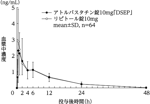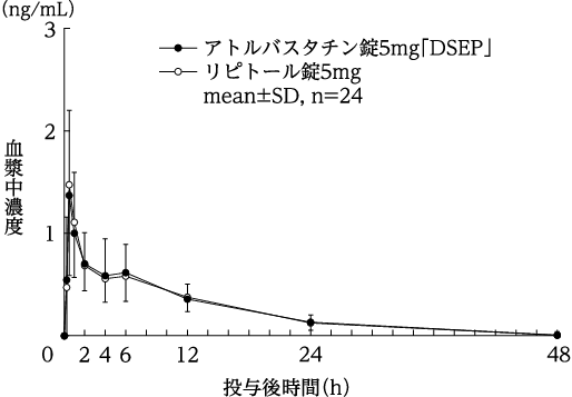 健康成人6例に、アトルバスタチン5注1)、10、20及び40mgを絶食下単回経口投与した結果、血漿中未変化体のCmax及びAUC0-∞は投与量に比例して増加し、Tmax及び半減期はほぼ一定であったことから、アトルバスタチンの体内動態は線形性を示すと考えられた1)。なお、日本人と外国人との体内動態を比較した結果、個人差を上回る人種差は認められなかった2)。