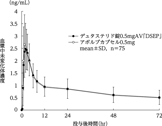 デュタステリド錠0.5mgAV「DSEP」とアボルブカプセル0.5mgを、クロスオーバー法によりそれぞれ1錠又は1カプセル(デュタステリドとして0.5mg)健康成人男子に絶食時単回経口投与して血漿中未変化体濃度を測定した。得られた薬物動態パラメータ(AUC、Cmax)について90%信頼区間法にて統計解析を行った結果、log(0.80)~log(1.25)の範囲であり、両剤の生物学的同等性が確認された7)。