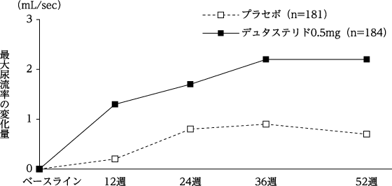 前立腺体積30mL以上の前立腺肥大症患者を対象とした二重盲検比較試験(1日1回52週間経口投与)において、デュタステリド(カプセル)0.5mgはプラセボに比し、I-PSS及び最大尿流率を有意に改善し、前立腺体積を有意に減少させた。