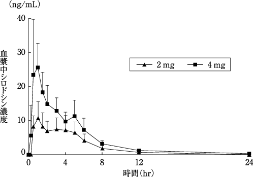 健康成人男性(各群6例)にシロドシン0.5mgから12mg(カプセル)を単回経口投与したとき注)、血漿中シロドシン濃度は投与量の増加に伴って上昇し、Cmax及びAUC0-∞は線形性を示した4)。シロドシン2mg又は4mg(カプセル)を単回経口投与したときの血漿中シロドシン濃度推移は下図に示すとおりであった5),6)。