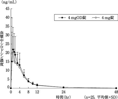 シロドシン4mgOD錠(水なし又は水で服用)とシロドシン4mg錠(標準製剤、水で服用)をクロスオーバー法によりそれぞれを1錠(シロドシンとして4mg)健康成人男性に絶食単回経口投与して注)、血漿中シロドシン濃度を測定して得られた薬物動態パラメータ(AUC0-48hr,Cmax)について、90%信頼区間法にて統計解析を行った結果、log(0.8)~log(1.25)の範囲内であり、両剤の生物学的同等性が確認された7)。薬物動態パラメータは下表に、血漿中濃度推移は下図に示すとおりであった。