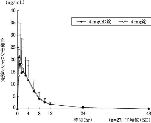 健康成人男性にシロドシン4mg(錠又はカプセル)を空腹時に単回経口投与したとき注)の血漿中シロドシン濃度及び薬物動態パラメータは下表に示すとおりであり、4mg錠及び4mgカプセルは生物学的に同等であった3)。