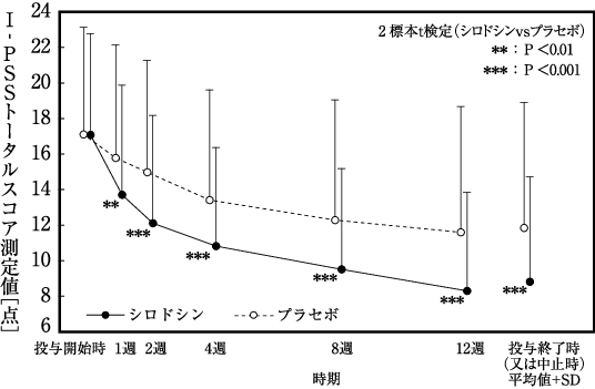 前立腺肥大症に伴う排尿障害患者を対象に、シロドシンカプセル1回4mg 1日2回又はプラセボを12週間経口投与した結果、終了時のI-PSSトータルスコアは投与開始時に比較して、シロドシンで8.3及びプラセボで5.3それぞれ低下した。また、投与開始時に比較してI-PSSトータルスコアが25%以上改善した症例の割合は、シロドシン76.4%(133/174例)及びプラセボ50.6%(45/89例)であり、重症度が軽症(I-PSSトータルスコア8未満)まで改善した症例の割合は、シロドシン47.7%(83/174例)及びプラセボ31.5%(28/89例)であった。シロドシンでは自覚症状は投与1週後の早期から改善し、重症例に対しても改善効果が認められた。副作用発現割合は、シロドシン群54.9%(96/175例)、プラセボ群22.5%(20/89例)であった。主な副作用は、シロドシン群で射精障害22.3%(39/175例)、軟便及び口渇各8.6%(15/175例)、尿失禁5.7%(10/175例)、下痢4.6%(8/175例)、鼻閉4.0%(7/175例)、プラセボ群で軟便、口渇及び頭痛各4.5%(4/89例)であった。副作用(臨床検査値)発現割合は、シロドシン群31.4%(55/175例)、プラセボ群21.6%(19/88例)であった。主な副作用(臨床検査値)は、シロドシン群ではトリグリセリド上昇12.0%(21/175例)、CRP上昇5.7%(10/175例)、γ-GTP上昇3.4%(6/175例)、プラセボ群ではトリグリセリド上昇10.2%(9/88例)、LDH上昇及びCRP上昇各3.4%(3/88例)であった11)。