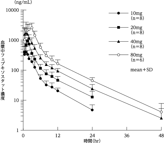 健康成人男性30例に、フェブキソスタットとして10、20、40及び80mg注1)を絶食下で単回経口投与したとき、血漿中フェブキソスタットの濃度推移及び薬物動態パラメータは以下のとおりである4),5)。