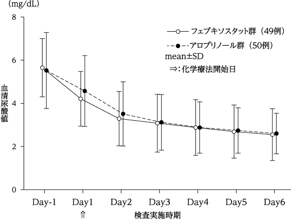 化学療法施行予定の悪性腫瘍患者99例を対象にアロプリノール対照非盲検無作為化比較試験を行った。フェブキソスタット60mg/日又はアロプリノールは300mg/日[腎機能障害のある患者(30≦eGFR<45mL/min/1.73m2)では200mg/日]を化学療法施行開始24時間前から6日間投与した。投与開始6日後までの血清尿酸値AUC(主要評価項目)は、アロプリノール群に対するフェブキソスタット群の非劣性が示された(非劣性マージンは150mg・hr/dL)。また、フェブキソスタット60mg/日の投与により血清尿酸値は投与開始6日後まで経時的に減少した28),29)。本試験におけるフェブキソスタット60mg/日の安全性評価対象49例中1例(2.0%)に副作用が認められた。その副作用は、AST増加、ALT増加であった。