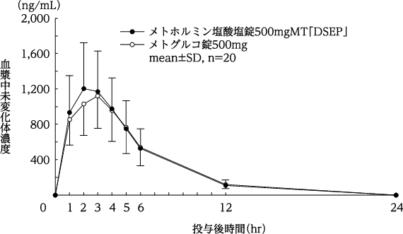 メトホルミン塩酸塩錠250mgMT「DSEP」は、「含量が異なる経口固形製剤の生物学的同等性試験ガイドライン(平成24年2月29日 薬食審査発0229第10号)」に基づき、メトホルミン塩酸塩錠500mgMT「DSEP」を標準製剤としたとき、溶出挙動が等しく、生物学的に同等とみなされた18)。