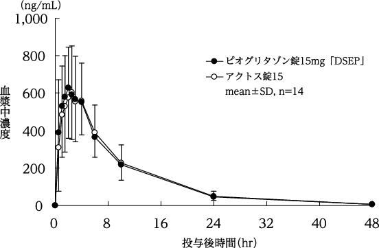 ピオグリタゾン錠15mg「DSEP」とアクトス錠15を、クロスオーバー法によりそれぞれ1錠(ピオグリタゾンとして15mg)健康成人男子に絶食時単回経口投与して血漿中未変化体濃度を測定し、得られた薬物動態パラメータ(AUC、Cmax)について90%信頼区間法にて統計解析を行った結果、log(0.80)~log(1.25)の範囲内であり、両製剤の生物学的同等性が確認された11)。
