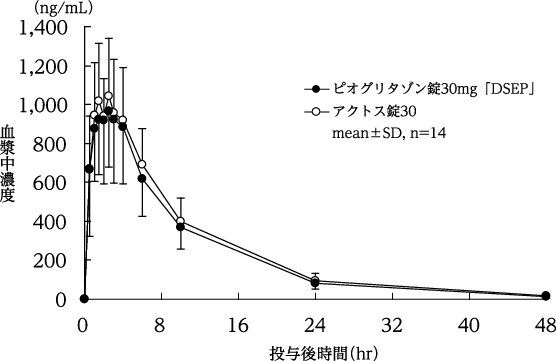 ピオグリタゾン錠30mg「DSEP」とアクトス錠30を、クロスオーバー法によりそれぞれ1錠(ピオグリタゾンとして30mg)健康成人男子に絶食時単回経口投与して血漿中未変化体濃度を測定し、得られた薬物動態パラメータ(AUC、Cmax)について90%信頼区間法にて統計解析を行った結果、log(0.80)~log(1.25)の範囲内であり、両製剤の生物学的同等性が確認された11)。
