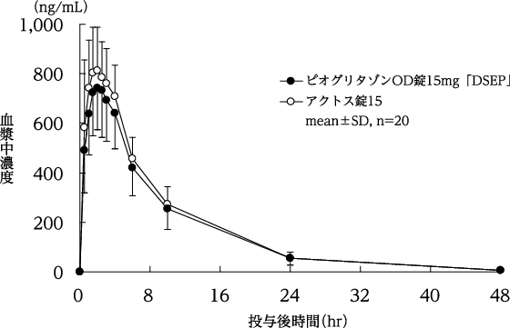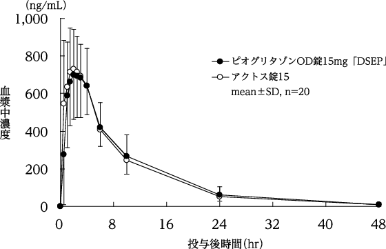 ピオグリタゾンOD錠15mg「DSEP」とアクトス錠15を、クロスオーバー法によりそれぞれ1錠(ピオグリタゾンとして15mg)健康成人男子に絶食時単回経口投与(水で服用及び水なしで服用)して血漿中未変化体濃度を測定し、得られた薬物動態パラメータ(AUC、Cmax)について90%信頼区間法にて統計解析を行った結果、log(0.80)~log(1.25)の範囲内であり、両製剤の生物学的同等性が確認された9)。