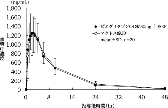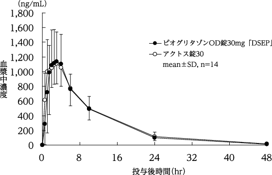 ピオグリタゾンOD錠30mg「DSEP」とアクトス錠30を、クロスオーバー法によりそれぞれ1錠(ピオグリタゾンとして30mg)健康成人男子に絶食時単回経口投与(水で服用及び水なしで服用)して血漿中未変化体濃度を測定し、得られた薬物動態パラメータ(AUC、Cmax)について90%信頼区間法にて統計解析を行った結果、log(0.80)~log(1.25)の範囲内であり、両製剤の生物学的同等性が確認された9)。