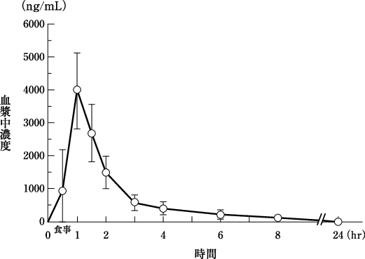 健康成人10例に50mgを食前30分に単回経口投与すると、血漿中濃度は1時間後に最高に達し、その濃度は3.9μg/mLである。血漿中半減期は1.8時間で、血漿中濃度は4時間後に0.37μg/mLとなる2)。