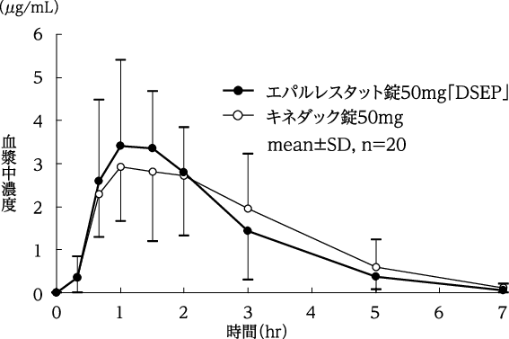 エパルレスタット錠50mg「DSEP」とキネダック錠50mgを、クロスオーバー法によりそれぞれ1錠(エパルレスタットとして50mg)健康成人男子に絶食時単回経口投与して血漿中未変化体濃度を測定し、得られた薬物動態パラメータ(AUC、Cmax)について90%信頼区間法にて統計解析を行った結果、log(0.8)~log(1.25)の範囲内であり、両製剤の生物学的同等性が確認された3)。