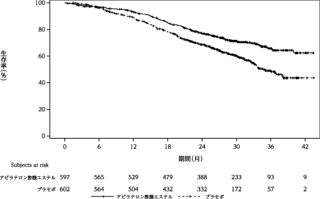 無症候性又は軽度の症状注1)を伴う化学療法歴のない転移性去勢抵抗性前立腺癌患者注2)を対象に、プレドニゾン注3)5mgの1日2回経口投与との併用下で、プラセボを対照として、アビラテロン酢酸エステル錠1,000mgを1日1回食事の1時間以上前又は食事の2時間以上後に連日経口投与した(有効性解析対象例は1,088例)。主要評価項目は、画像判定(中央判定)による無増悪生存期間(radiographic progression free survival、rPFS)及び全生存期間(OS)と設定された。rPFSの中央値は、アビラテロン酢酸エステル錠群では推定不能、プラセボ群では8.3カ月であり、アビラテロン酢酸エステル錠群のプラセボ群に対する優越性が示された(ハザード比0.425、95%信頼区間:0.347-0.522、p値<0.0001、層別ログランク検定)。また、OSに関する中間解析(目標イベント数である773イベントの43%のイベントが発生した時点)の結果、中央値は、アビラテロン酢酸エステル錠群では推定不能、プラセボ群では27.2カ月であった(ハザード比0.752、95%信頼区間:0.606-0.934、p値=0.0097、層別ログランク検定)20)。