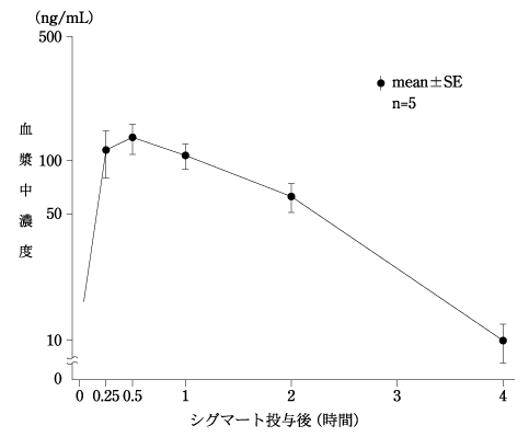 健康成人5例にシグマート錠5mg 2錠(ニコランジルとして10mg)を単回投与注1) したとき、以下のような薬物動態パラメータが得られた1) 。