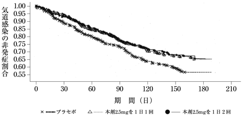 軽度から中等度の肺機能低下(努力肺活量(FVC)が予測値の40%以上)を伴う5歳以上の嚢胞性線維症患者968例(プラセボ群325例、本剤2.5mg1日1回群322例、本剤2.5mg1日2回群321例)を対象とした二重盲検比較試験において、投与後6カ月間の「非経口抗生物質の投与を必要としたすべての気道感染の発症率」及び「非経口抗生物質の投与を必要とした治験実施計画書で定義注1)された気道感染の発症率」は、それぞれ以下のとおりであった4)(外国人データ)。