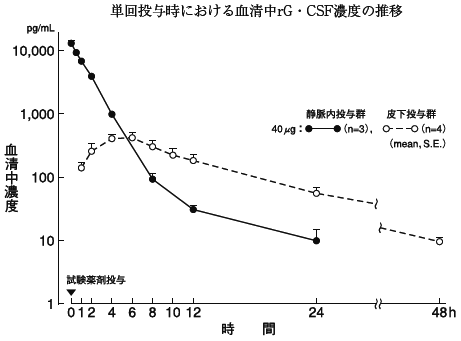 健康成人男子に本剤を静脈内(レノグラスチムとして1、10、20、40μg/body)注5) 及び皮下(レノグラスチムとして10、20、40μg/body)注5) に単回投与し、血清中濃度を測定したところ、皮下投与では、投与4~6時間後まで上昇し以後穏やかな減少を示したが、静脈内投与では、投与後速やかに消失し4~8時間後には同一用量の皮下投与群の値以下となり、投与24時間後にはほとんど検出されなくなった3) 。