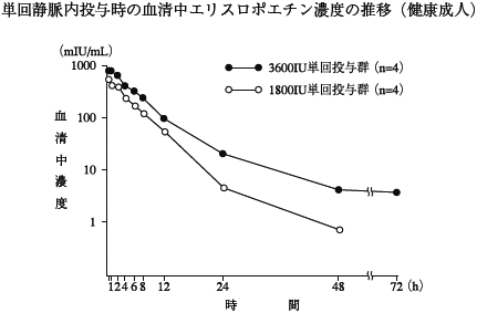 血液透析患者8名に1800国際単位(IU)注5) を単回静脈内投与した場合のt1/2は、9.4時間と健康成人より消失が遅延する傾向が認められた10) 。