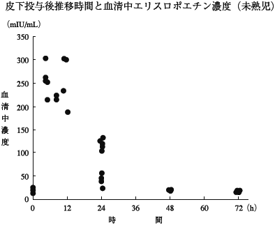 未熟児に200国際単位(IU)/kgを週2回8週間皮下投与し、20名より得られた血清中濃度測定値により母集団薬物動態解析を行った。反復の各投与時間を0時間とし、推移時間と血清中濃度とをプロットしたものは下記の通りであった。得られた母集団パラメータよりベイジアン法により推定したCL、Vd及びt1/2の平均値は、それぞれ41.7mL/h/kg、530mL/kg、9.02時間であった11) 。