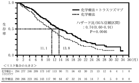 HER2過剰発現(IHC法3+又はFISH法陽性)の進行・再発の胃又は胃食道接合部腺癌患者(化学療法未治療)584例を対象に、化学療法(カペシタビン+シスプラチン又はフルオロウラシル+シスプラチン)と化学療法+本剤を比較する第Ⅲ相臨床試験を実施した。本剤は初回8mg/kg(体重)、2回目以降6mg/kgを3週間間隔で、化学療法中止後も病勢進行が認められるまで同一の用法・用量で投与を継続した。化学療法は、カペシタビン1000mg/m2の1日2回14日間経口投与又はフルオロウラシル800mg/m2の5日間持続静脈内投与とシスプラチン80mg/m2の静脈内投与を3週間間隔で行った。目標イベント数の75%時点の中間解析において、化学療法+本剤は化学療法単独に比べて、主要評価項目である全生存期間において有意な延長が認められた。なお、化学療法の内訳は584例中、カペシタビン+シスプラチンが511例、フルオロウラシル+シスプラチンが73例であった。国内では、全例(101例)においてカペシタビン+シスプラチンが使用された25)。ToGA試験のうち本剤が投与された294例において、副作用が283例(96.3%)に認められた。主な副作用は、悪心186例(63.3%)、好中球減少症157例(53.4%)、嘔吐129例(43.9%)、食欲不振121例(41.2%)、疲労87例(29.6%)、下痢85例(28.9%)、手掌・足底発赤知覚不全症候群72例(24.5%)、口内炎66例(22.4%)等であった。そのうち、本試験に参加した国内症例51例において、副作用が50例(98.0%)に認められ、主な副作用は食欲不振43例(84.3%)、悪心41例(80.4%)、腎機能障害31例(60.8%)、好中球減少症30例(58.8%)、嘔吐29例(56.9%)、疲労29例(56.9%)、口内炎26例(51.0%)、しゃっくり20例(39.2%)、手掌・足底発赤知覚不全症候群19例(37.3%)、便秘18例(35.3%)等であった。,