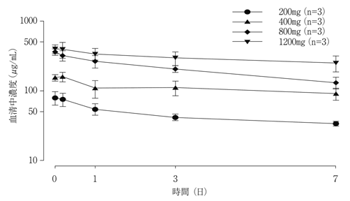 CD20陽性のB細胞性非ホジキンリンパ腫患者に本剤200、400、800及び1200mg注1)を点滴静注したときの血清中濃度推移及び薬物動態パラメータは以下のとおりであった。AUClast及びCmaxは200~1200mgの用量範囲で用量比例性を示した。全身クリアランス(CL)及び消失半減期(t1/2)は投与量によらず同程度の値を示した1)。