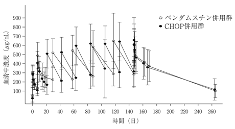 未治療CD20陽性濾胞性リンパ腫患者に化学療法(CHOP又はベンダムスチン)併用下で本剤を、1サイクル3週間を最大8サイクル又は1サイクル4週間を最大6サイクルにわたって点滴静注したときの血清中濃度推移及び薬物動態パラメータは以下のとおりであった2)。なお、本剤はサイクル1の1日目及び8日目、以降は各サイクルの1日目に1000mgを点滴静注した注2)(外国人における成績)。