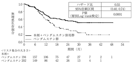 リツキシマブ治療抵抗性のCD20陽性低悪性度非ホジキンリンパ腫患者396例を対象に、ベンダムスチンを対照群とし、本剤とベンダムスチンを併用したときの有効性を検討した。対照群は、ベンダムスチン120mg/m2を4週間毎に各サイクルの1日目及び2日目に投与注4)し、最大6サイクル繰り返した。維持療法期においては経過観察とされた。本剤併用群は、本剤1000mgを4週間毎に各サイクルの1日目に投与し、サイクル1のみ8日目、15日目にも本剤1000mgを投与した。併用するベンダムスチンは90mg/m2を各サイクルの1日目及び2日目に投与した。導入療法期間は6サイクルとし、導入療法終了時に病勢の進行が認められない場合は、維持療法として本剤1000mgを2カ月毎に2年間投与した。その結果、低悪性度非ホジキンリンパ腫患者396例において、本剤併用群では、対照群に比べ主要評価項目である中央判定による無増悪生存期間の有意な延長が認められ(ハザード比[95%信頼区間]:0.55[0.40~0.74]、[層別Log-rank検定:P=0.0001(有意水準両側0.015)]、2014年9月1日データカットオフ)、中央値[95%信頼区間]は本剤併用群では未達[22.5カ月~推定不能]、対照群では14.9カ月[12.8~16.6カ月]であった。また、濾胞性リンパ腫患者321例における中央判定による無増悪生存期間のハザード比[95%信頼区間]は0.48[0.34~0.68]であった4)。濾胞性リンパ腫患者の安全性評価対象164例において、156例(95.1%)に副作用が認められた。主な副作用は、infusion reaction(64.6%)、悪心(45.7%)、疲労(35.4%)、好中球減少(33.5%)、感染症(28.7%)であった。注4) ベンダムスチン単独投与における国内承認用法・用量:通常、成人には、ベンダムスチン塩酸塩として120mg/m2(体表面積)を1日1回1時間かけて点滴静注する。投与を2日間連日行い、19日間休薬する。これを1サイクルとして、投与を繰り返す。なお、患者の状態により適宜減量する。
